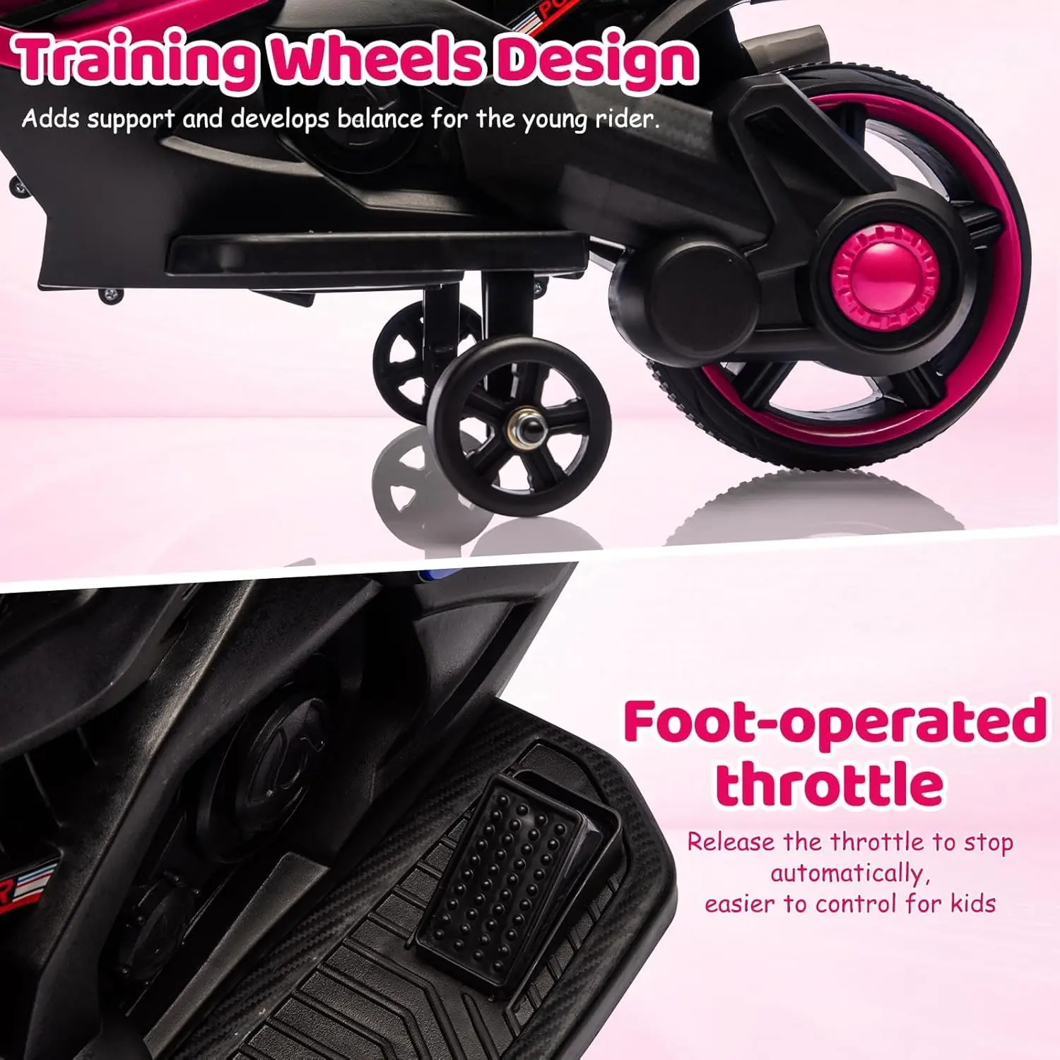 Rendimiento estable en todo terreno: Equipada con neumáticos de EVA duraderos, la motocicleta eléctrica maneja el césped, el pavimento y las superficies interiores con facilidad.Las ruedas de entrenamiento integradas de nuestra motocicleta eléctrica para niños brindan asistencia adicional para el equilibrio, lo que ayuda a los niños pequeños a desarrollar confianza mientras aprenden a conducir.