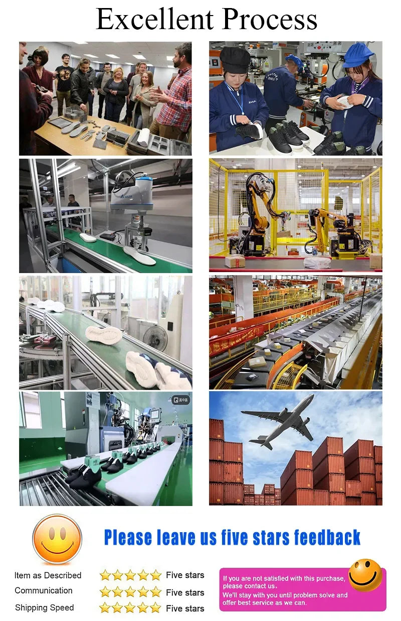 Los zapatos pueden experimentar una ligera fricción y deformación durante el transporte, lo cual es normal. Si recibe zapatos con problemas de calidad, contáctenos de inmediato.